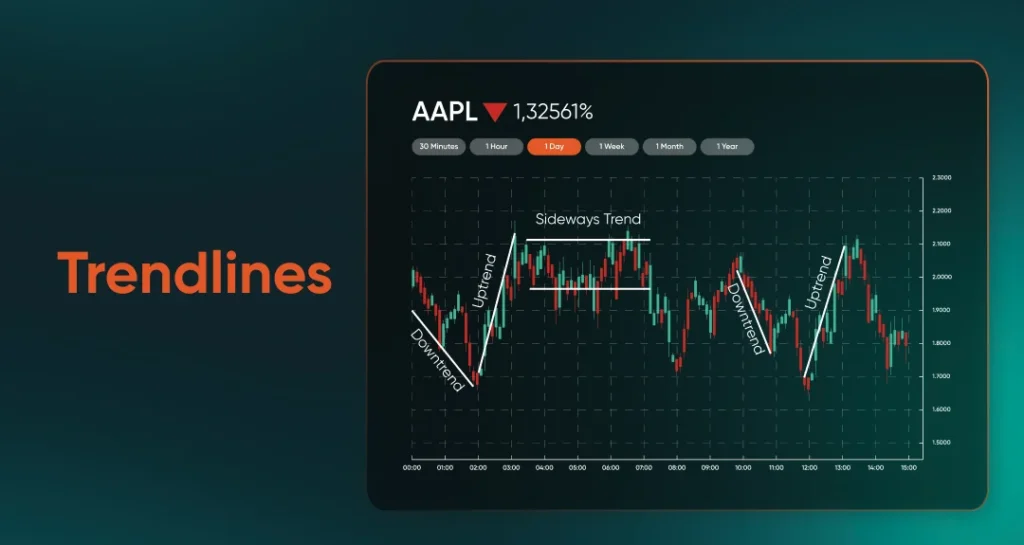 Besides charting uptrends, downtrends or sideways trends, trendlines are also useful for visualising levels of support and resistance.