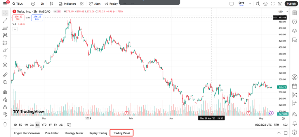 TradingView’s built-in trading panel offers real-time trade management, including position sizing, P&L tracking, and order editing. It closely replicates the experience of managing a live trading account, making it ideal for practice and strategy testing.