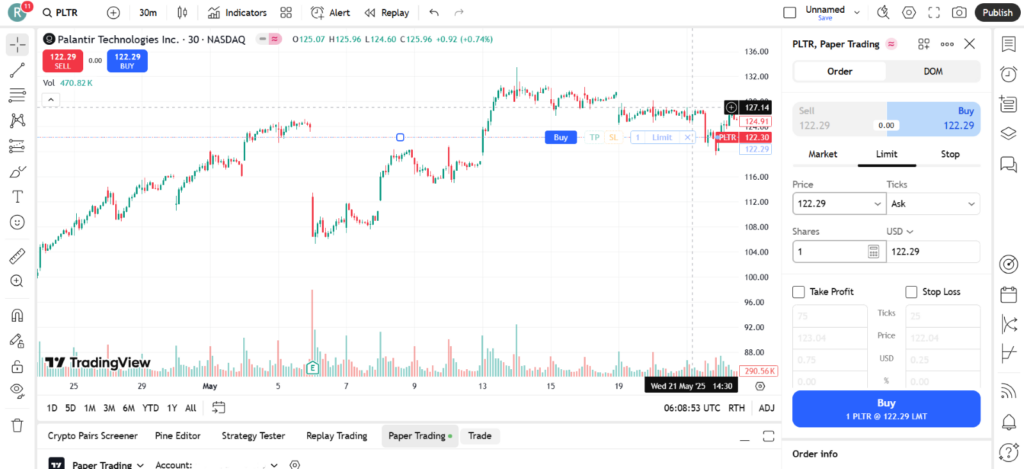 Paper trading on TradingView allows you to place market, limit, and stop orders in a simulated environment—mirroring how they would behave in real market conditions. This helps you gain practical experience and better understand how each order type works without risking actual capital.