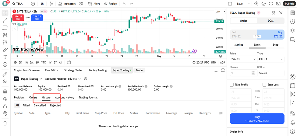 TradingView automatically records your trade history. Use the History tab in the trading panel to: