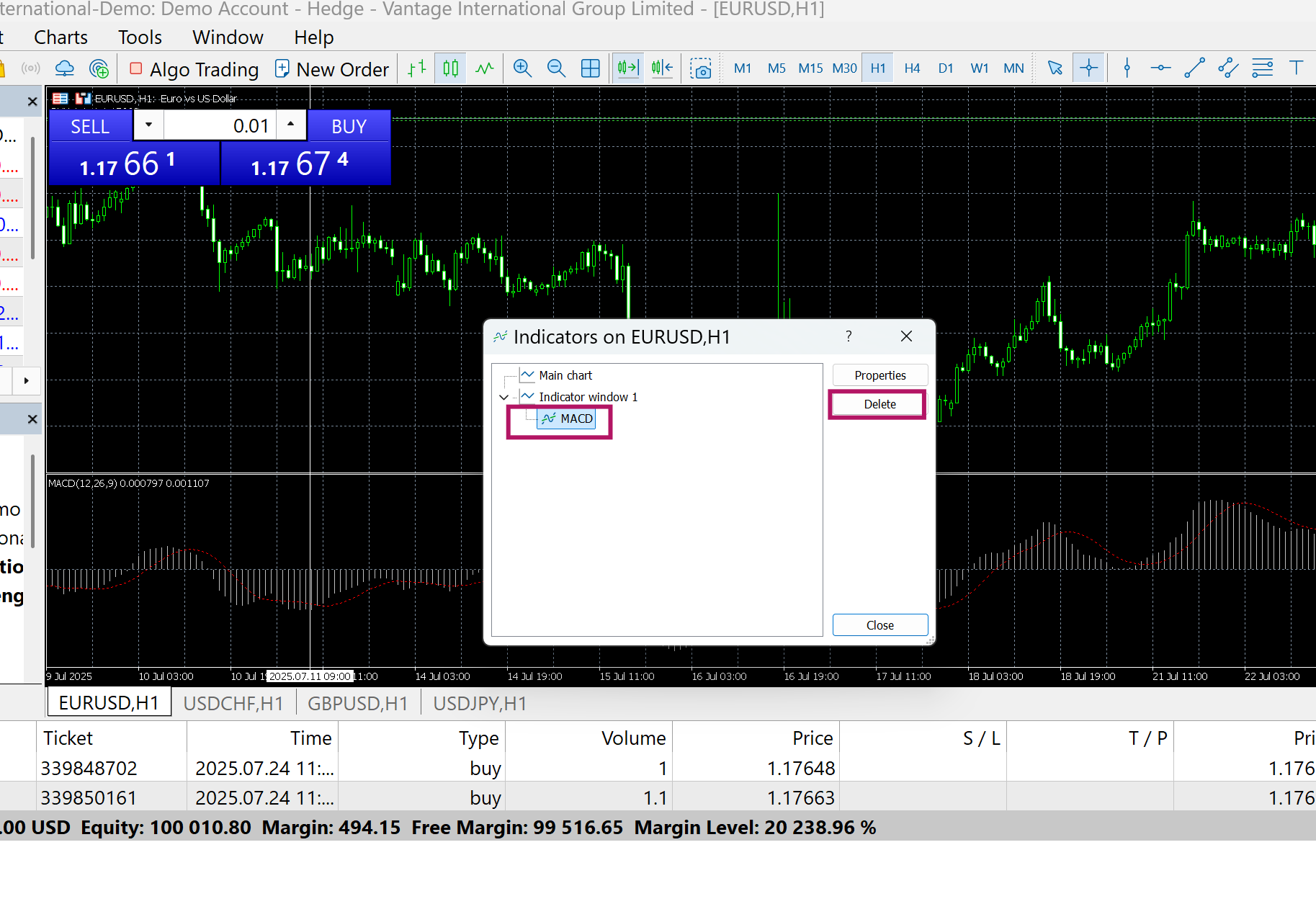 In the pop-up window, you can select the indicator you want to remove, then click Delete.