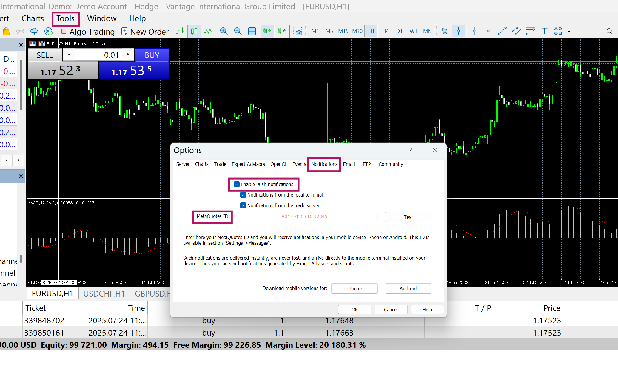 You can set up MT5 to send push notifications to your mobile phone and to email. This feature makes it handy to keep track of your trades, alerting you when your orders are executed.