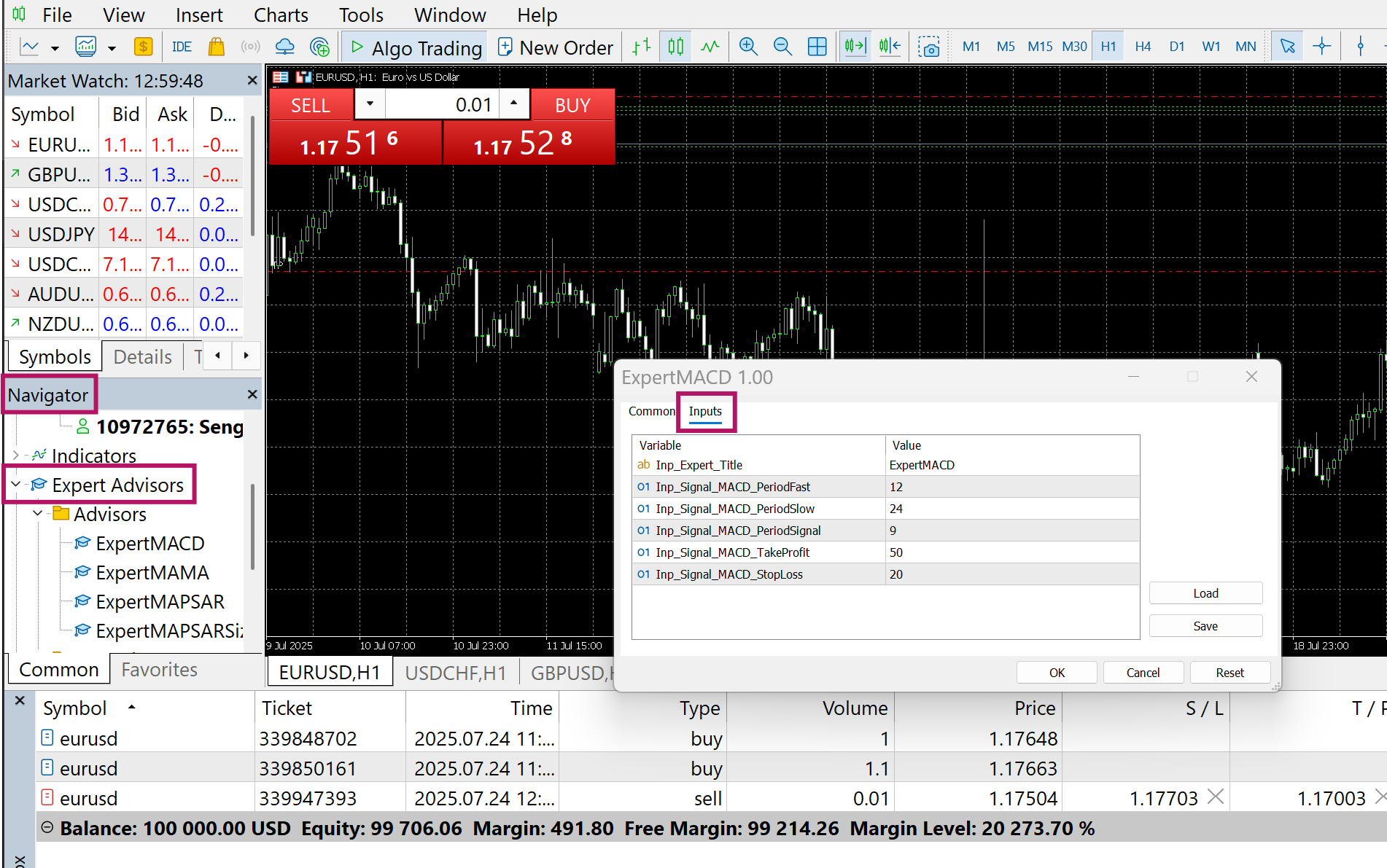 4. The selected EA will be added to MT5 and will appear in your Navigator window.