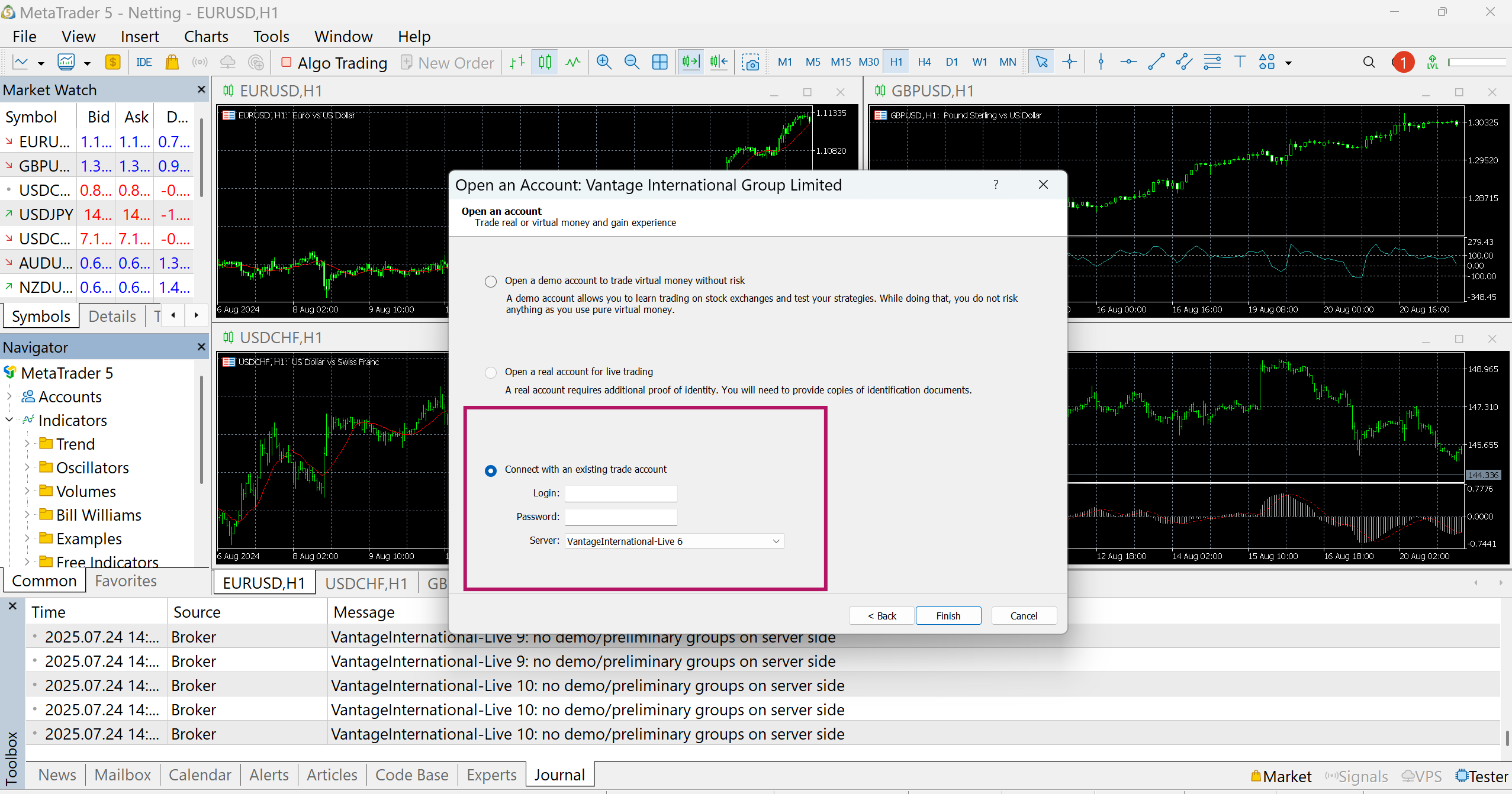 You can explore live or demo accounts with Vantage to get started on MT5.
