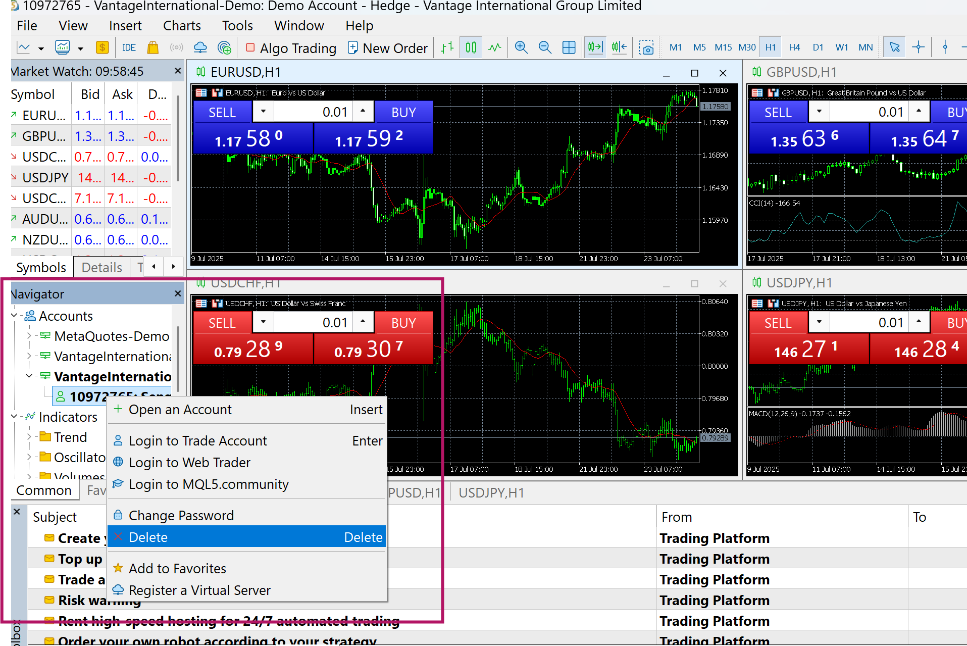 3. Select your account, right-click, then click Delete. This will remove your credentials and log you out of MT5.