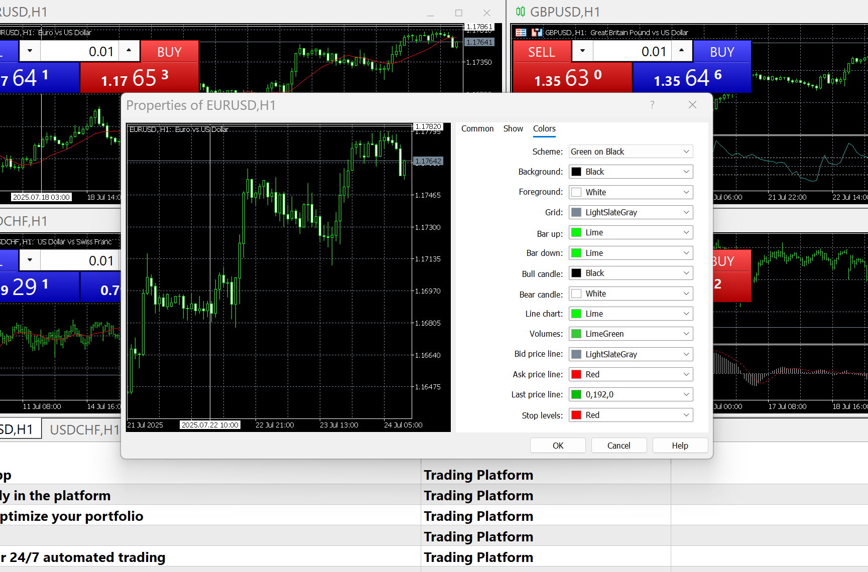 Price charts will be one of the main elements that you will be viewing and interacting with mostly when trading with MT5. You can customise the appearance of price charts to your preference.