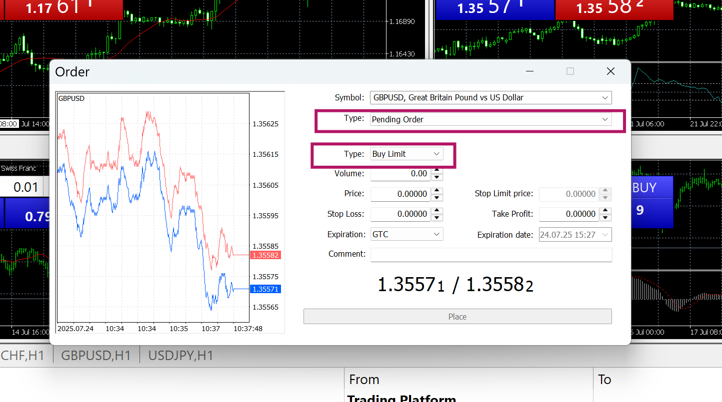 4. Once done, click on Place to place your trade. MT5 will attempt to fill your order when the stipulated conditions are met.