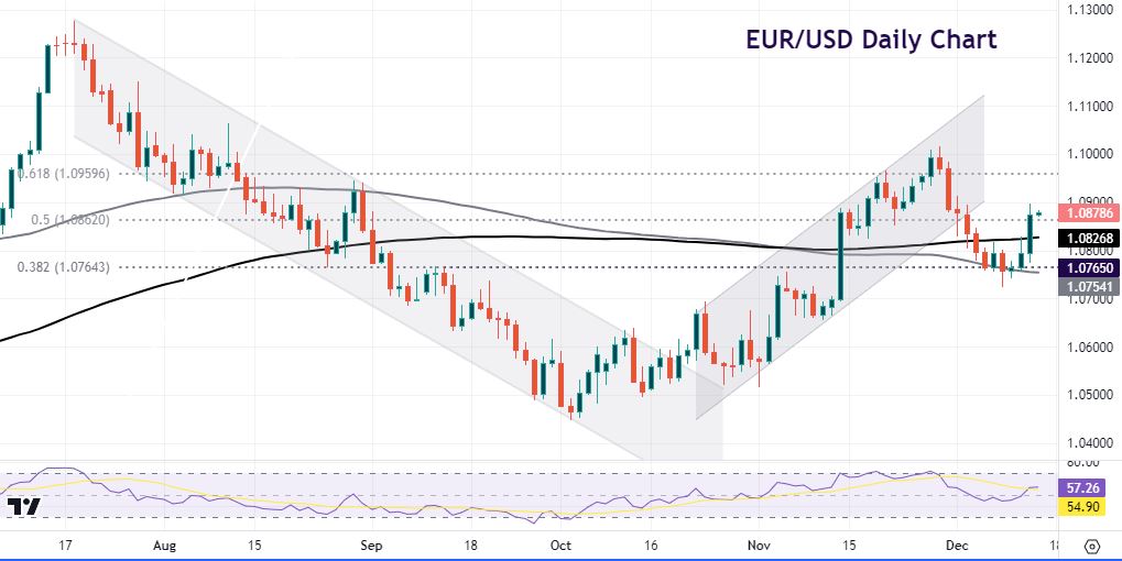 Support had been found at a major Fib level of the summer rally at 1.0764. The 100-day SMA is just below here at 1.0754. The major surged during and after the FOMC meeting. Yesterday’s move breached the 200-day SMA at 1.0826 and the 50% mark of the summer move at 1.0862. November highs sit above 1.10.