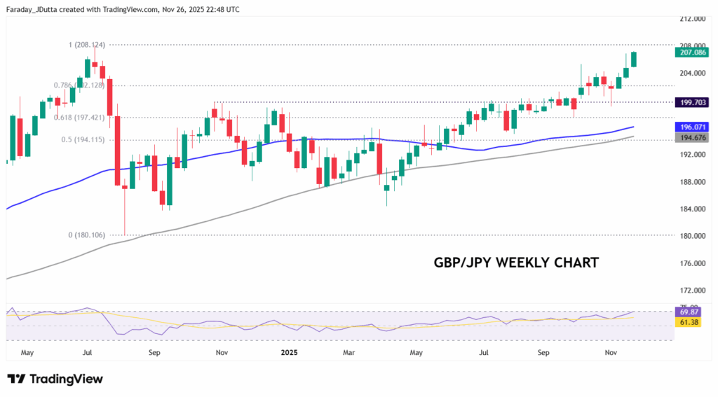 This very popular cross has just broken to new highs last seen in July 2024.  After trading around 200 for some time, prices pushed higher in early October above 205 before trading sideways and then falling back below the psychological 200 marker. November has seen strong bullish momentum this month with the pair pushing above the October top at 205.31. Bulls will target that July 2024 high at 208.12. A minor Fib level sits at 202.12.