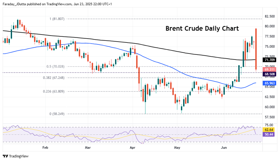 Brent crude saw a near 13% intraday swing from high to low after a dramatic day of conflict in the Middle East. Fears of strong retaliation by Iran which caused crude to spike initially on the open were slowly reined in during the day. The eventual strike on Qatar was seen as symbolic and largely to save face. Oil prices had been fading through the day as it was recognised that the Strait of Hormuz was very unlikely to be impacted. A quarter of all seaborne oil flows through the Strait with more than 80% of that going to Asia and China. Iran also imports a lot of its food, while 20% of global LNG moves through the shipping channel too. “Escalation to de-escalate” seems to be the play with Middle east tensions heightened but easing. Prices didn’t get as far as the year-to-date January top at $81.80 and have plunged through the 200-day SMA at $71.70. The swing low from September 2024 is at $68.50 with the midpoint of this year’s sell-off at $70.02.