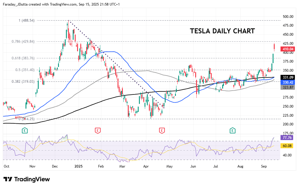 US stocks: The S&P 500 gained 0.47% to close at 6,615, the 25th record high close of 2025. The benchmark index is up seven of the past nine trading days and up 32.8% since the April Liberation Day low. The Nasdaq rose by 0.84% to settle at 24,294, a third straight record closing high and a ninth straight day of gains. The latter hasn’t been seen since November 2023. The Dow Jones finished at 45,883, up 0.11%. Sectors were mixed with the heavy-cap sectors (Communication, Consumer Discretionary and Tech) outperforming, while Consumer Staples and Healthcare lagged. Breadth was negative with around 200 gainers to 300 losers. Big Tech again led the gainers though Nvidia finished very modestly in the red due to China antitrust investigations, even as it pared some of its losses. Google joined the $3trn market cap club while Tesla rallied on the Musk share purchases.