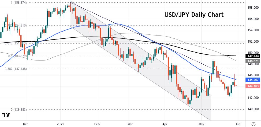 USD/JPY fell below 140 in late April but then rebounded above 148 in mid-May. Seven consecutive days of selling followed and a few days of buying recently may have been halted with the rejection of higher prices yesterday through the 50-day SMA. This has acted as resistance previously and currently sits at 145.20. Near-term support is around 142.10/20.