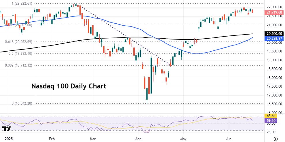 We note that energy market volatility could be an argument for Fed officials and Chair Powell to fend off President Trump and his calls for interest rate cuts, as it gives the Fed more reason to assess the impact from both those geopolitical concerns and tariffs on the economic outlook. We have the Nasdaq record top at 22,222 with initial support around 21,500 and then 21,000.